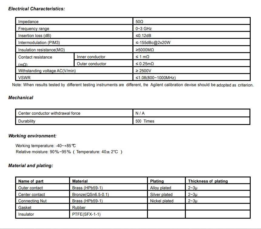 The available N connectors are designed and manufactured with brass plating, Ni/Au plated, with Teflon insulator, its inner conductor is bronze, Au plated.